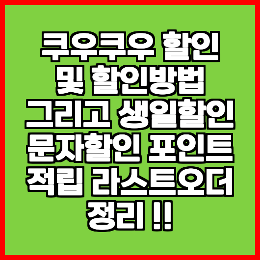 쿠우쿠우의 할인 방법에는 생일 할인, 문자 할인, 포인트 적립 등이 있습니다. 각 할인 방법에 따라 제공되는 혜택이 다르므로 잘 확인하고 이용하세요.